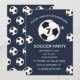7th Birthday party for a soccer fan, sports, kids, boys, for him. Blue and white, modern, elegant Birthday party invitation. Please personalise it with your details.