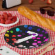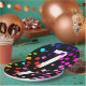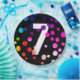 Neon rainbow dot pattern on black background for 7th birthday party.