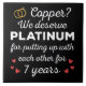 'Copper? We deserve Platinum for putting up with each other for 7 Years' quote for a couple who got married 7 years ago or a couple renewing wedding vows on their copper anniversary.