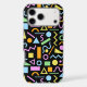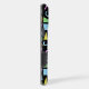 1980s style pattern in colorful shapes of green, yellow, blue and yellow on a black background.