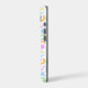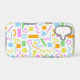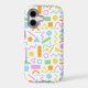 1980s style pattern in colorful shapes of green, yellow, blue and yellow on a white background.