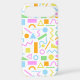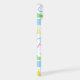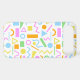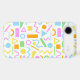 1980s style pattern in colorful shapes of green, yellow, blue and yellow on a white background.