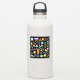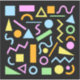 1980s style pattern in colourful shapes of green, yellow, blue and yellow on a black background.