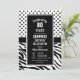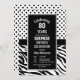 A black and white 80th surprise birthday party invitation featuring polka dots and zebra stripes.