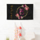 A banner for a 80th birthday party. A chic black background with a faux gold geometric frame. Decorated with dark purple and burgundy flowers, roses and boho style feathers. Templates for a name, age and a date. Date of birth or the date of the party. The name is written with a hand lettered style script, pink coloured letters, age 80 in purple and the date with golden numbers. The text: Welcome