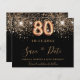 A girly and trendy Save the Date for a 80th birthday party. A black background decorated with faux gold glitter. Templates for a date and name and text. Golden coloured letters. The text: Save the Date is written with a large trendy hand lettered style script.