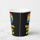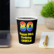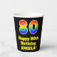 This fun and exciting birthday paper cup design features a large number “80” with a rainbow spectrum gradient inspired pattern, along with the message “Happy 80th Birthday,”, and a custom name. It also has a black-coloured background. Vibrant, colourful paper cups like this might be fun to use at a birthday party/celebration being held in celebration of somebody’s 80th birthday. [~Z0000537]