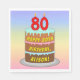 This fun and colourful birthday themed paper napkin design features a cartoon-style depiction of a three-tier birthday cake having number-shaped candles on top showing the age “80“, along with the message “HAPPY 80TH BIRTHDAY,”, and a customisable recipient name. The background features a multi-colour pastel rainbow spectrum inspired gradient pattern. Paper napkins like these might be used when celebrating somebody’s eightieth birthday. [~Z0000623]