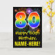 The front of this exciting, fun, and colorful birthday themed greeting card design features a large number "80" with a rainbow spectrum gradient inspired pattern, along with the message "Happy 80th Birthday,", and an editable recipient name. The front additionally features a colorful bursting celebratory fireworks inspired background pattern. The inside features an editable birthday greeting message, or could perhaps be cleared and left blank if a message is to be written by hand instead. A personalized birthday card like this might be a fun way to celebrate somebody’s eightieth birthday. [~Z0000442]