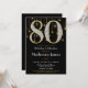 An elegant 80th birthday party invitation in black and gold, featuring a large 80 with diamonds and gold appearance along with a glittery curtain of gold lights. For the 80th birthday man or woman in your life.