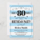 80th Birthday Invitation Blue and White Stripes Typography. Cheers to 80 years. Adult Birthday. Male Men or Women Birthday. Kids Boy or Girl Lady Teen Teenage Bday Invite. 13th 15th 16th 18th 20th 21st 30th 40th 50th 60th 70th 80th 90th 100th. Any Age. For further customisation, please click the "Customise it" button and use our design tool to modify this template.