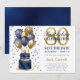 This fabulous men's 80th birthday party Save the Date card featuring a 2-layer navy blue and gold cake with navy blue and gold balloons, the number 80 in gold and shiny blue confetti would be perfect for asking people to put this special date aside for the upcoming 80th Birthday Party. It is traditional and classic while being fresh, modern and contemporary. The back is a coordinating navy blue foil.