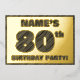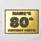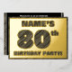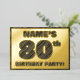 The front of this bold eightieth birthday celebration/party foil invitation card features a custom name, a large number “80th”, the message “BIRTHDAY PARTY!”, and a border, all featuring a rustic, yet sophisticated, faux wood grain look inspired pattern. The back features personalised details about the event, such as the date, time, location, and any other information that may be important. Personalised invitations like these might be used to invite guests to a birthday gathering/party being held in celebration of somebody’s 80th birthday. [~Z0000595]