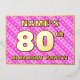 The front of this upbeat eightieth birthday party/celebration foil invitation card design features a customisable name, a large number “80th”, the message “BIRTHDAY PARTY!”, and a border. The background of the front features a fun pattern with light pink and dark pink stripes and heart shapes. The back features personalised details about the event, such as the date, time, location, and any other information that may be important. Editable invitations like these might be a fun way to invite attendees to a birthday party being held in celebration of somebody’s 80th birthday. [~Z0000603]