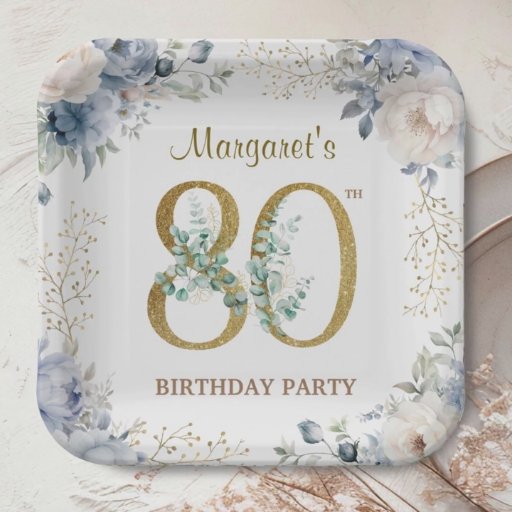 80th Birthday Elegant Gold & Dusty Blue PeonyDesigned by H-Art Studio Design