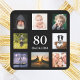 A sticker for a 80th birthday party for a guy, celebrating his life with a collage of 8 of your own photos. Templates for the age 80 and a date. Date of birth or the date of the party. White coloured letters. Black background.