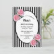 Classic slim black and white vertical stripes as background. With pink roses as decoration. An oval frame with templates for your party information.