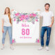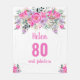 Elegant design for a 80th birthday party with a pink "80 and fabulous" and a scripted name embellished by a feminine watercolor flowers on a white background. Customise age, text, name and background colour.