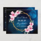 On front: Trendy tropical style. With a faux gold geometric frame decorated with pink hibiscus, flowers tropical florals with some greenery. A dark blue tropical night sky with a full moon as background Templates for a name and date. White letters. The name and the text: Save the Date are written with a modern hand lettered style script.