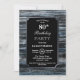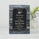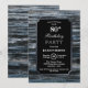 A rustic silver-bordered blue barn wood 80th birthday invitation with the white text highlighted on a black background.
