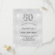 A modern, stylish and glamourous invitation for a 80th birthday party. A faux silver looking background, decorated with glitter dust. Personalise and add your name nad party details. Number 80 is written with a balloon style font, script.