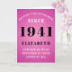 80th birthday born in 1941 pink greeting card. Easily customise the text to the front and the interior of this birthday card using the template provided. Part of the setting standards range of greeting cards.