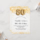 For an elegant 80th birthday party. A chic white background. Decorated with faux gold glitter, sparkles. Personalise and add a name, age and party details. The name is written with a hand lettered style script. Number 80 with balloon style font.