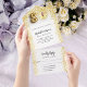 A white background, decorated with faux gold confetti on the inside. Personalise and add a photo, name, party details, RSVP date, return address and name.