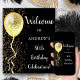 Customisable 80th birthday welcome poster, featuring a gold glitter balloon, with a shower of gold glitter on a black background.