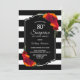 Black and white striped 80th surprise birthday dinner party invitation featuring elegant red and orange floral displays. Text is fully customisable to enable you to include all of your own information for your birthday celebration.