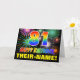 The front of this cheerful, colorful, and fun birthday-themed greeting card design features a large number "81" and the message "HAPPY BIRTHDAY,", both colored with a rainbow spectrum gradient inspired pattern, along with a bold yellow editable recipient name. The front also has a multicolored background pattern inspired by the look of bursting celebratory fireworks. The inside features a customizable birthday greeting message, or could perhaps be cleared and left blank if a message is to be written by hand instead. A vibrant personalized birthday card like this might be a fun way of acknowledging somebody’s eighty first birthday. [~Z0000471]