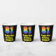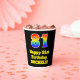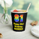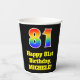 This fun and exciting birthday paper cup design features a large number “81” with a rainbow spectrum gradient inspired pattern, along with the message “Happy 81st Birthday,”, and a personalised name. The background is coloured black. Vibrant, colourful paper cups like this might be fun to use at a birthday celebration/party being held to celebrate somebody’s 81st birthday. [~Z0000537]