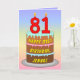 This cheerful and joyful birthday-themed greeting card design features a cartoon-style depiction of a three-tier birthday cake having number-shaped candles on top showing the age “81“, along with the message “HAPPY 81ST BIRTHDAY,”, and a custom recipient name. The background of the front features a multi-colour pastel rainbow spectrum inspired gradient pattern. The inside has a personalised birthday greeting message, or could perhaps be cleared and left blank if a message is to be written by hand instead. An upbeat, personalised birthday greeting card like this might be a fun way to send some birthday wishes to somebody who is celebrating their eighty-first birthday. [~Z0000625]