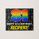 This bold and vibrant birthday themed jigsaw puzzle design features a large number “81” with a multicolored rainbow spectrum inspired gradient pattern, along with the message “HAPPY 81st BIRTHDAY,”, and a personalised recipient name. The background features an exciting, colourful pattern featuring star shapes of various sizes. A colourful, customisable birthday puzzle like this might be a fun way to deliver birthday greetings to somebody who is celebrating their eighty-first birthday. [~Z0000607]