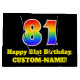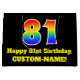This fun and colourful birthday themed giftbag design features a large number "81" with a rainbow spectrum gradient inspired pattern, along with the message "Happy 81st Birthday,", and an editable name. It also has a black-coloured background. A vibrant gift bag like this might be used when wrapping presents being given to somebody in celebration of their eighty first birthday. [~Z0000521]
