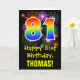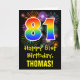 The front of this exciting, colorful, and fun birthday themed greeting card design features a large number "81" having a rainbow spectrum gradient inspired pattern. It also features the message "Happy 81st Birthday,", and an editable recipient name. The front additionally has a colorful background pattern inspired by the appearance of bursting celebratory fireworks. The inside features a personalized birthday greeting message, or could perhaps be cleared and left blank if a message is to be written by hand instead. A personalized birthday card like this might be a fun way to send a message celebrating somebody’s eighty first birthday. [~Z0000442]