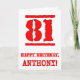 This fun birthday-themed greeting card design features a large red number “81” having a rubber stamp inspired look, along with the birthday greeting message “HAPPY BIRTHDAY,” and a personalised name on the front. The inside has a custom birthday greeting message, or could perhaps be cleared and left blank if a message is to be written by hand instead. A fun personalised birthday greeting card like this might be a fun way to deliver a birthday greeting message to somebody who is celebrating their eighty-first birthday. [~Z0000524]