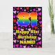 The front of this happy and joyful birthday themed greeting card design features a large number “81” having a rainbow spectrum gradient inspired pattern. It also features the message “Happy 81st Birthday,”, and a personalised name. The background of the front features a pattern of heart shapes with colours like purple, red, and pink. The inside has a custom birthday greeting message, or could perhaps be cleared and left blank if a message is to be written by hand instead. An upbeat, customisable birthday greeting card like this might be sent to celebrate somebody’s eighty-first birthday. [~Z0000551]
