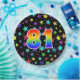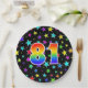 This cheerful, fun, and colourful paper plate design features a large number "81" having a rainbow spectrum gradient inspired pattern colouring. The background features a colourful pattern of star shapes. Fun paper plates like this might be used at somebody’s eighty first birthday celebration, or a couple’s 81st anniversary party, or some other eighty first event. [~Z0000493]