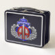 This is a standard metal lunchbox that appears to work just fine. We designed this box ourselves with an uploaded photo and custom text on the front and back. It looks absolutely beautiful except the front of the lunchbox is not centered like it shows in the photo. The print borders don't align with the inset flat part of the box where the preview photo online showed it perfectly centered in there. The back looks nice and centered though.