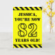 The front of this attention-grabbing and bold birthday-themed greeting card design features a personalized name and the message "YOU’RE NOW 82 YEARS OLD!" in black stencil inspired text on a yellow colored background. The front also features an eye-catching black and yellow striped pattern at the top and bottom edges. The inside features a custom birthday greeting message, or could perhaps be cleared and left blank if a message is to be written by hand instead. A personalized birthday card like this might be a fun way to send a message in celebration of somebody’s eighty second birthday. [~Z0000413]