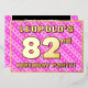The front of this upbeat and loving eighty-second birthday party foil invitation card design features a personalised name, a large number “82nd”, the message “BIRTHDAY PARTY!”, and a border. The background of the front features a joyful light pink and dark pink stripes pattern containing heart shapes. The back features personalised details about the event, such as the date, time, venue/location, and any other useful information. Editable invitations like these might be a fun way to invite attendees to a birthday party being held in celebration of somebody’s 82nd birthday. [~Z0000603]