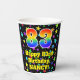 This cheerful and colourful birthday-themed paper cup design features a large number “83” having a rainbow spectrum gradient inspired pattern. It also features the message “Happy 83rd Birthday,”, and a customisable name. The background features a multicolored star field inspired pattern. Colourful, vibrant paper cups like this might be fun to use at a birthday party being held in celebration of somebody’s eighty third birthday. [~Z0000540]