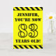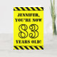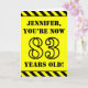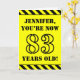 The front of this bold and attention-grabbing birthday-themed greeting card design features a personalized name and the message "YOU’RE NOW 83 YEARS OLD!" in black stencil look text on a yellow colored background. The front also features an eye-catching yellow and black stripes pattern at the top and bottom edges. The inside features a customized birthday greeting message, or could perhaps be cleared and left blank if a message is to be written by hand instead. A birthday card like this might be a fun way to send birthday wishes to somebody who is celebrating their eighty third birthday. [~Z0000413]