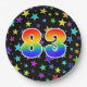 This fun, colourful, and cheerful paper plate design features a large number "83" containing a rainbow spectrum gradient inspired pattern. The background features a pattern of colourful star shapes. Fun paper plates like this might be used at a celebration being held in honour of somebody’s eighty third birthday, or a couple’s eighty third anniversary, or some other eighty third event. [~Z0000493]