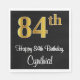 This sophisticated, stylish, and luxurious birthday themed paper napkin design features a large ordinal number “84th” having a faux/imitation gold-inspired appearance, in addition to the birthday greeting message “Happy 84th Birthday,” and an editable name in a script-style font. It also has a black-coloured background. Paper napkins like this might be used at a birthday party for somebody who is celebrating their 84th birthday. [~Z0000516]