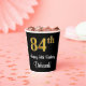 This stylish, luxurious, and sophisticated birthday-themed paper cup design features a large ordinal number “84th” having a faux/imitation gold-inspired appearance, along with the birthday greeting message “Happy 84th Birthday,” and an editable name in a script-style font. It also has a black-coloured background. Elegant birthday themed paper cups like this might be used at a party celebrating somebody’s eighty fourth birthday. [~Z0000538]