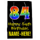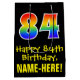 This colourful, fun, and exciting birthday giftbag design features a large number "84" with a rainbow spectrum gradient style pattern, along with the message "Happy 84th Birthday,", and a personalised recipient name. It also has a black-coloured background. A giftbag like this might be used when giving a gift or present in honour of somebody’s eighty fourth birthday. [~Z0000512]