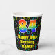 This colourful and joyful music-themed birthday paper cup design features a large number “84” with a rainbow spectrum gradient inspired pattern, along with the message “Happy 84th Birthday,”, and a custom name. The background features a multicolored pattern having music notes and symbols of various colours and sizes. Colourful, vibrant paper cups like this might be fun to have at a birthday celebration/party being held to honour somebody’s eighty fourth birthday. [~Z0000541]