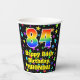 This colourful and fun birthday paper cup design features a large number “84” having a rainbow spectrum gradient inspired pattern. It also features the message “Happy 84th Birthday,”, and a custom name. The background features an exciting and colourful pattern having many star shapes with different sizes and colours. Colourful, vibrant paper cups like this might be fun to use at a birthday celebration/party being held to celebrate somebody’s eighty fourth birthday. [~Z0000540]